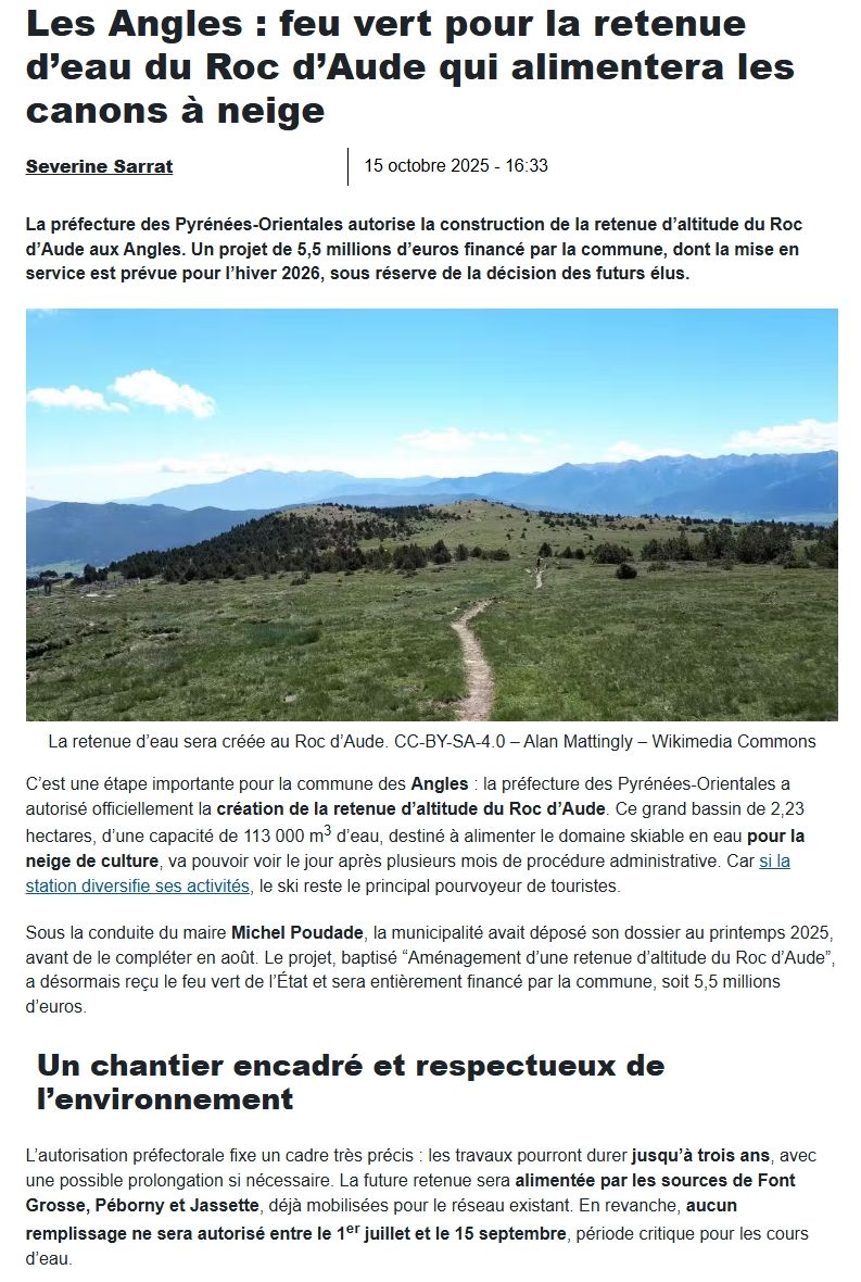 Un projet de retenue d'eau collinaire a été dévoilé. Ce projet se situe aux abords du Roc d'Aude a plus de 2200 m d'altitude et doit servir à alimenter les canons à neige de la station durant les 30 prochaines années. C'est plus de 100 000 m" d'eau sur plus de 3 hectares qui vont refaçonner le site.